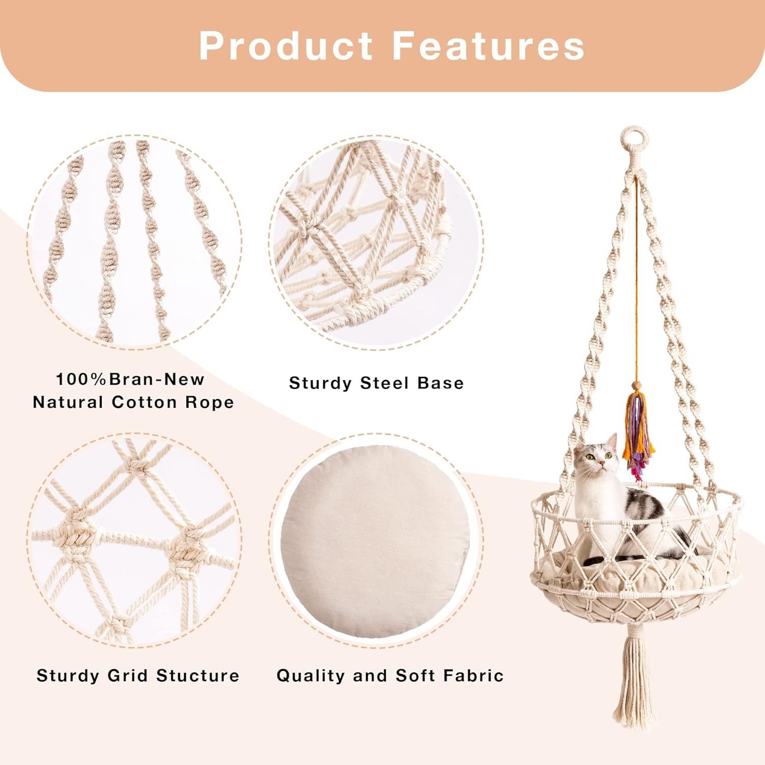 Made from 100% natural high-quality cotton rope with a stable double steel hoop base. The bottom is reinforced with a metal frame to maintain balance and minimize swinging, keeping your cat secure at all times.